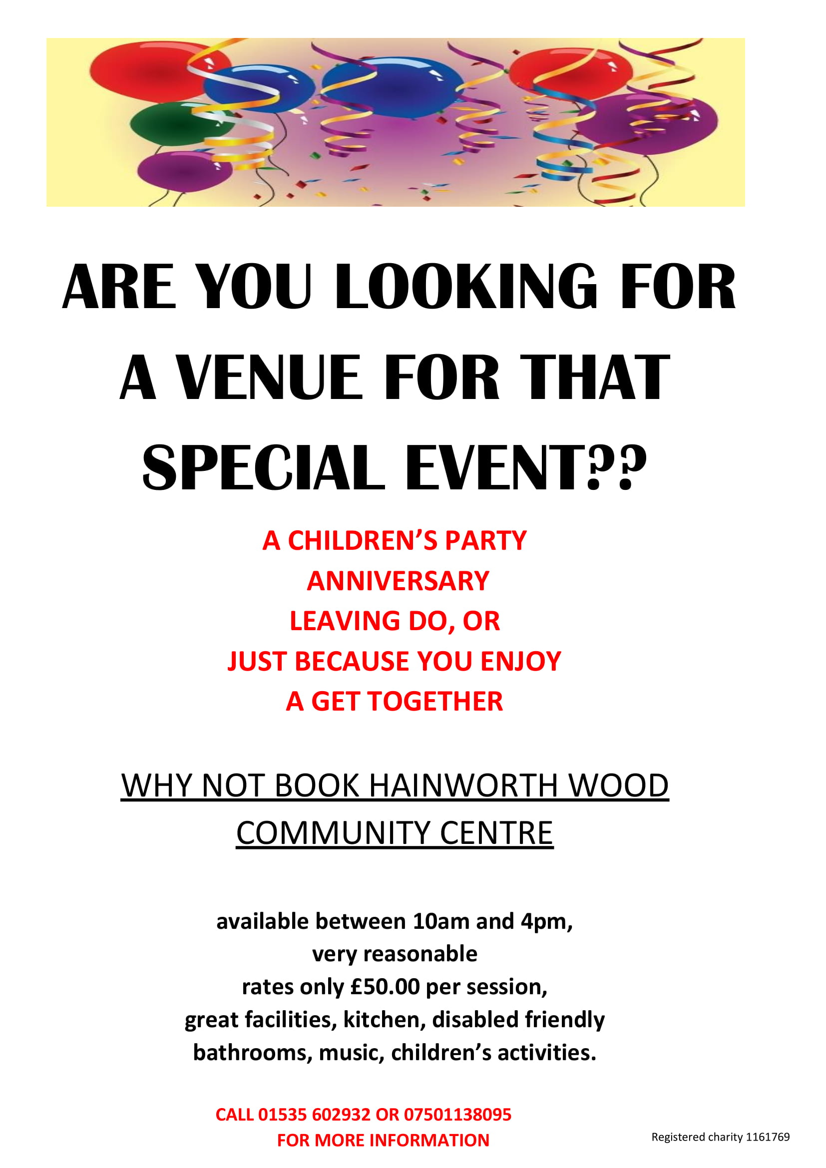 DURING THE COURSE OF ANY ONGOING EVENTS AT HAINWORTH WOOD COMMUNITY CENTRE THERE WILL BE PHOTOGRAPHS TAKEN.
